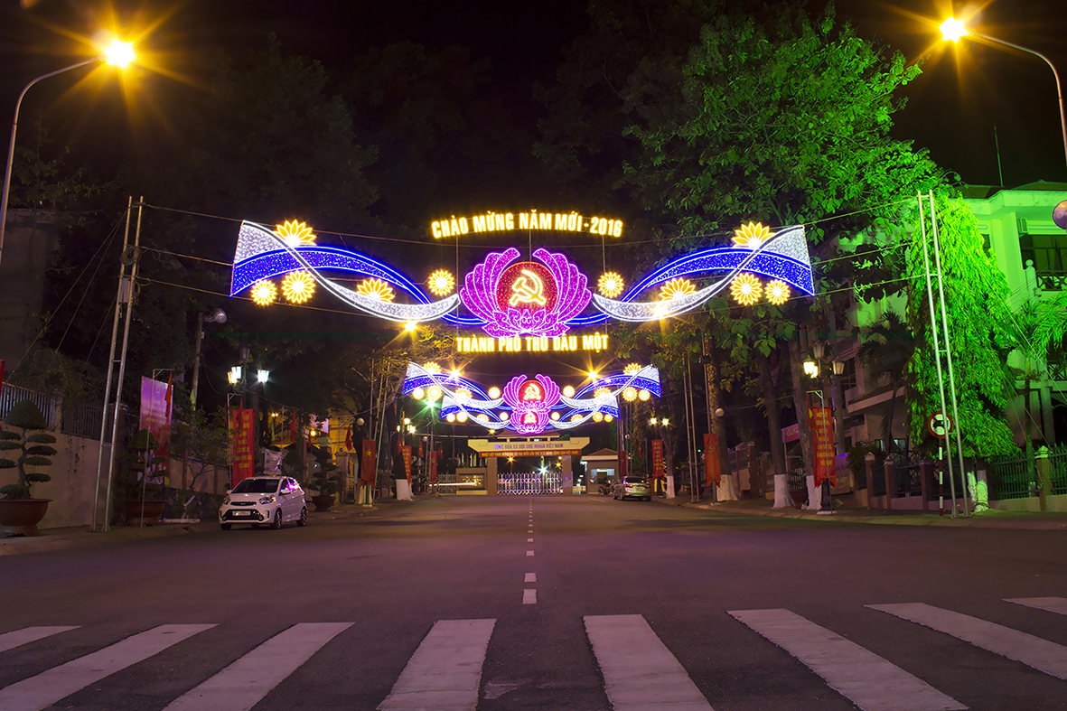 Hòa trong không khí rộn ràng đón Xuân mới 2016 trên khắp cả nước, các tuyến đường trung tâm thành phố Thủ Dầu Một như Cách Mạng Tháng Tám, Pasteur, Quang Trung, Trần Hưng Đạo hướng về Vòng xoay ngã sáu, đượng giăng đèn hoa rực rỡ.