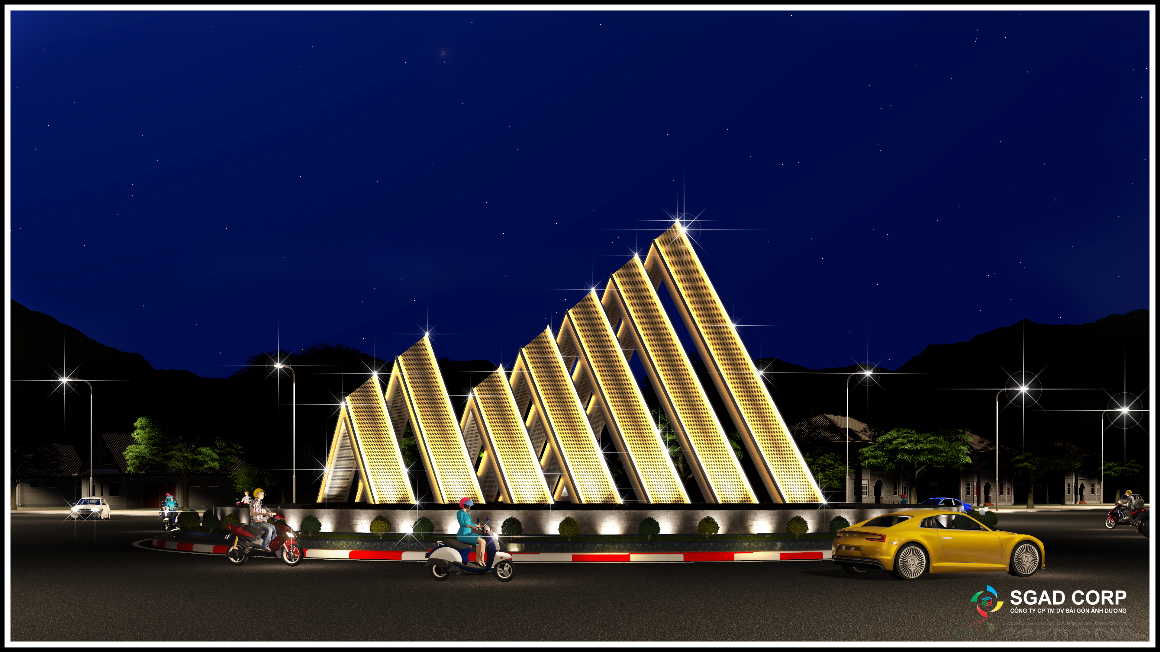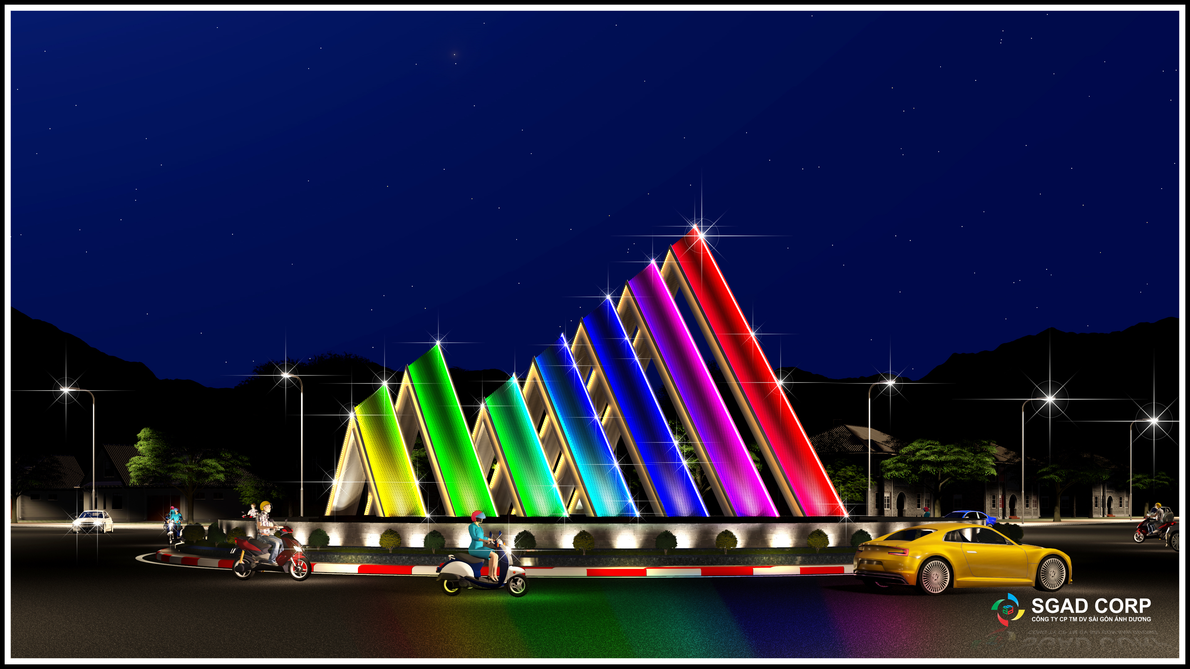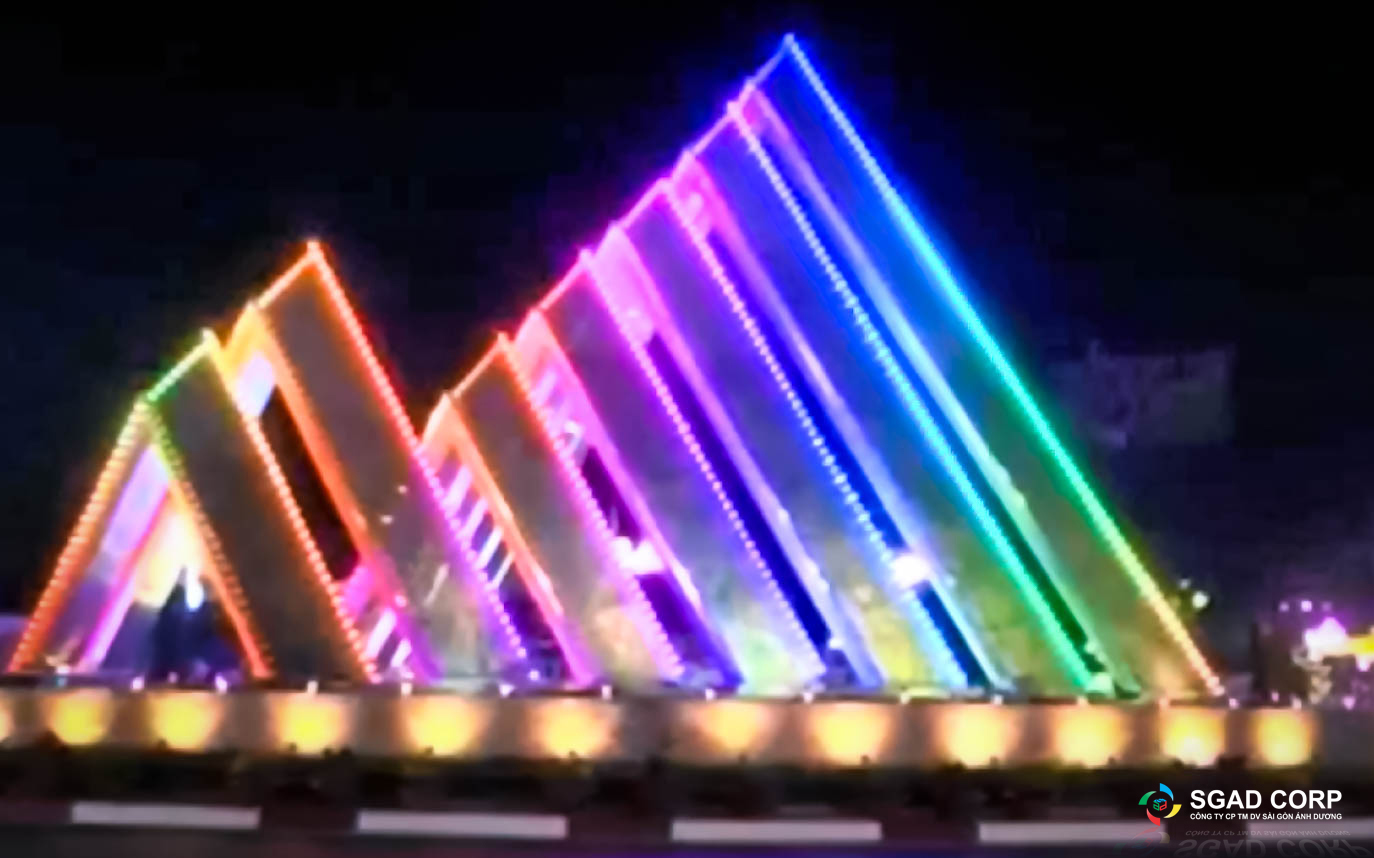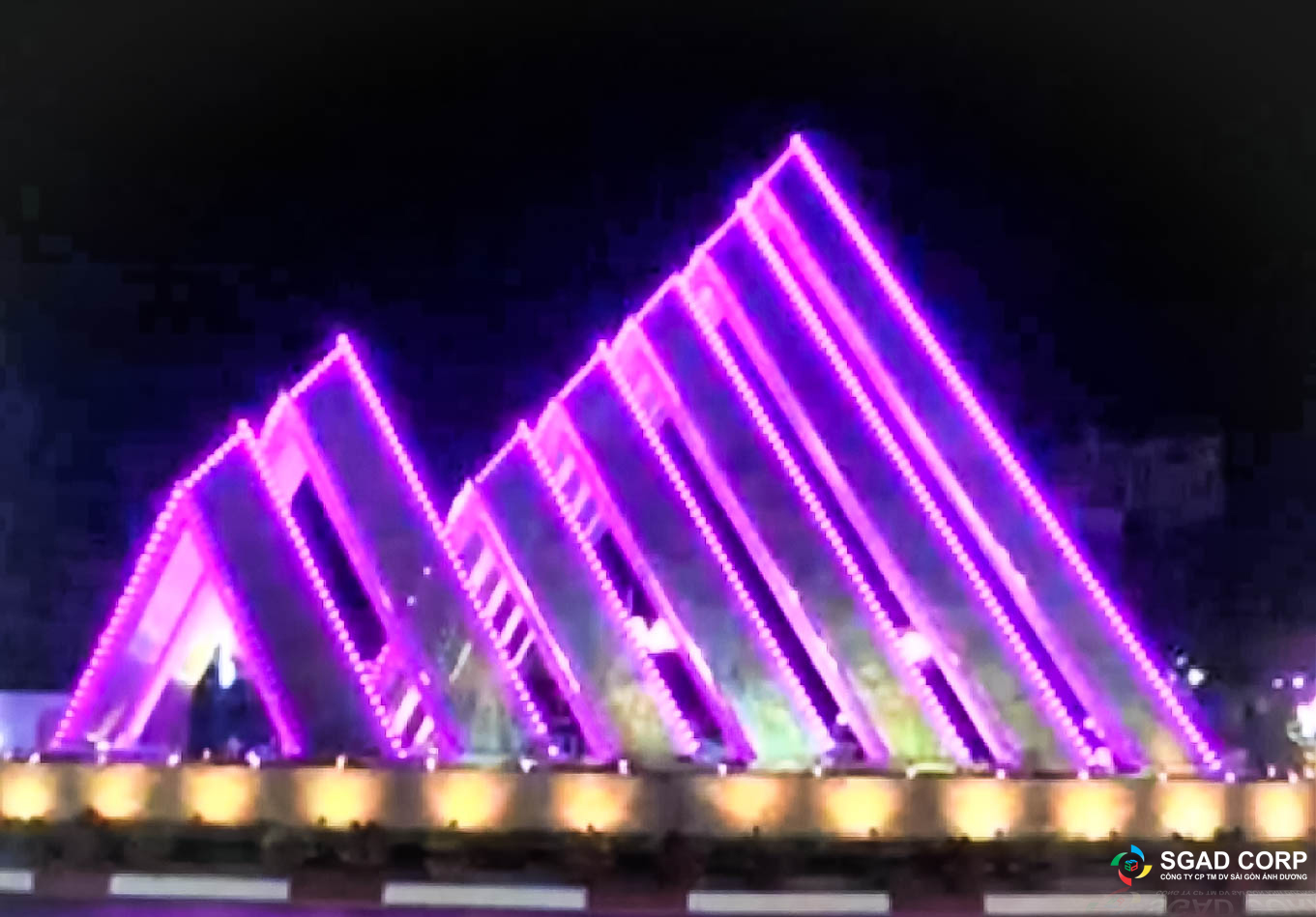 Công trình được xây dựng với vật liệu chính là thép tạo hình kết hợp với nhạc nước và ánh sáng đèn LED trang trí xung quanh họa tiết khối biểu trưng và xung quanh hồi nước. Khối biểu trưng sử dụng đèn LED module RGB chạy hiệu ứng đổi màu tạo thêm sự sinh động và thu hút được sự chú ý của mọi người về vẻ đẹp của khối biểu trưng. Các ngọn tháp biểu trưng rừng rực đèn đêm và soi trong bóng nước hồ tròn, tạo khung cảnh lộng lẫy và rực rỡ khi về đêm.